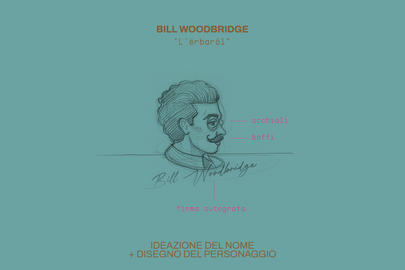 Tutto ha avuto inizio con il nostro racconto di una figura iconica: Bill Woodbridge, conosciuto tra i monti camuni come l’“ërbaröl”. Il nostro compito è stato quello di trasformare questa storia in un’immagine visiva potente. Non volevamo un logo astratto o impersonale, per questo abbiamo scelto di disegnare a mano l’illustrazione di Bill, curando ogni minimo dettaglio:
