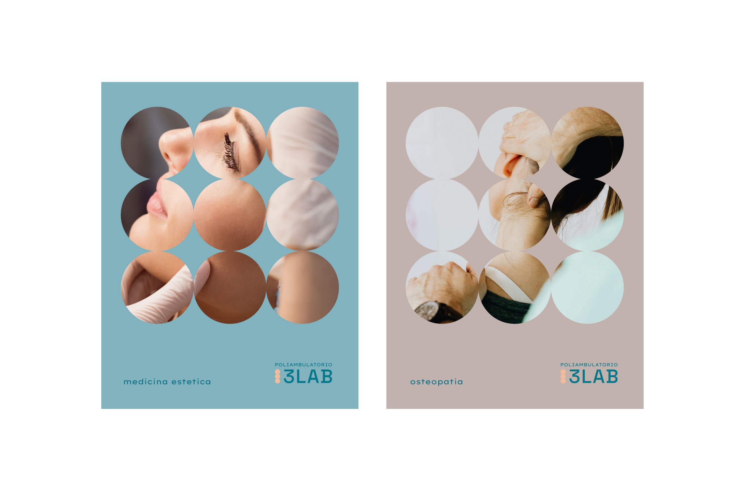 Il marchio è composto da un logotipo essenziale e da un simbolo costituito da tre cerchi sovrapposti, che richiamano il nome “3Lab” e rappresentano i diversi ambiti di intervento: salute fisica, equilibrio mentale e benessere estetico. La sua semplicità lo rende versatile, riconoscibile e facilmente applicabile a diversi supporti di comunicazione. Il font scelto è moderno e minimal.