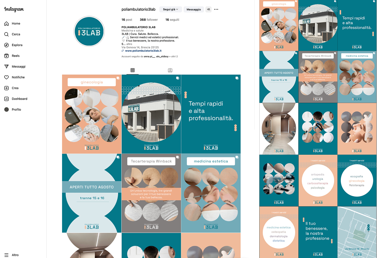 Per accompagnare l’apertura del Poliambulatorio 3Lab abbiamo sviluppato anche la strategia social, con l’obiettivo di costruire una presenza digitale coerente e riconoscibile. Abbiamo definito un tone of voice chiaro e professionale, capace di comunicare in modo accessibile i valori del centro e di trasmettere fiducia. Il sistema visivo riprende i tre cerchi come elemento grafico distintivo e li declina in template modulari per post e stories, garantendo uniformità e versatilità. La palette colori e la fotografia coordinata rafforzano l’identità del brand.